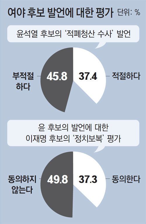 국민의힘 윤석열 대선 후보의 ‘적폐청산 수사 예고’ 발언에 대해 “부적절하다”고 생각하는 유권자들이 45.8%인 것으로 나타났다. 또 윤 후보의 발언을 두고 ‘정치 보복’이라는 이재명 대선 후보의 평가에 동의하지 않는다는 응답 역시 과반에 육박했다. 20일 동아일보의 3차 대선 여론조사에서 “집권하면 문재인 정권에 대한 적폐청산 수사를 할 것”이라는 윤 후보의 발언에 대해 ‘적절하다’는 응답은 37.4%, ‘부적절하다’는 응답은 45.8%로 집계됐다. 이런 윤 후보의 발언을 두고 정치 보복이라고 한 이 후보의 발언에 동의하는지를 묻는 질문에는 ‘동의한다’는 응답이 37.3%, ‘동의하지 않는다’는 응답이 49.8%로 나타났다.