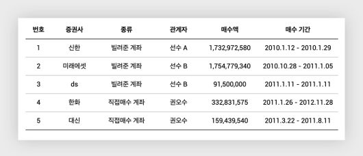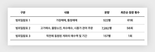 세 개의 범죄 일람표 가운데 가장 주목해야할 것은 작전에 동원된 계좌의 매수액 및 거래 기간이 정리돼 있는 ‘범죄일람표 3’이다. 모두 157개의 계좌가 나오는데, 이 계좌들은 두 가지로 분류돼 있다.