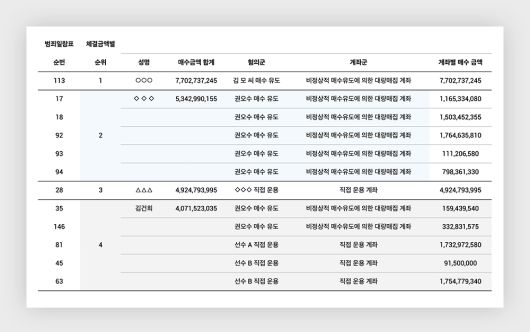 범죄일람표에 나온 계좌주들의 매수 액수를 많은 순으로 정리한 표. 김건희 씨는 40억 7천만 원으로 4위에 해당한다.