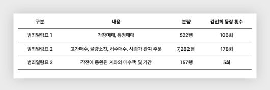 법무부가 국회에 제출한 검찰의 공소장과 범죄일람표는 모두 비실명화 되어 있다. 그러나 뉴스타파는 윤석열 후보 측이 공개한 김건희 씨의 2010년 계좌 내역과 지난 18일 보도한 김건희 씨의 거래 시간 데이터 등을 교차 분석해 범죄일람표에서 김건희 씨의 거래 내역을 특정해낼 수 있었다. 김건희 씨의 도이치모터스 주식 거래 시간 데이터는 뉴스타파 데이터 포털 등에 공개되어 있다.