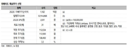 목표주가는 2022년 예상 주당순이익(EPS) 3591원에 가상화폐 거래소 사업자인 코인베이스, 국내 게임사 엔씨소프트(036570)와 펄어비스(263750)의 평균 주가수익비율(PER) 24배에 국내 블록체인 플랫폼 선점 효과 기대로 할증 30%를 적용했다고 설명했다.