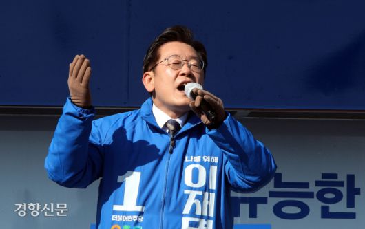 이재명 더불어민주당 대선후보가 지난 20일 오후 경기 안양중앙공원에서 열린 유세에서 발언하고 있다. 권호욱 선임기자 |