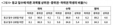 하지만 학교 내 학생들 간 학업 불평등은 코로나19 사태 이전에 비해 크게 심화됐다. 연구진이 과학고와 외국어고 등 특수목적고를 제외한 일반고등학교의 학업성취도를 분석한 결과 등교 일수가 적은 학교일수록 불평등 정도는 더 큰 것으로 확인됐다. 실제로 등교일수 100일 이상인 학교의 국·영·수 중위권 비율은 각각 90%, 88.9%, 89.2%였지만, 등교일수 100일 미만인 학교의 국·영·수 중위권 비율은 각각 86.9%, 84.8%, 84.3%로 3~5%포인트 더 낮았다. 반면 상위권·하위권 학생 비율은 등교일수가 적은 학교에서 상대적으로 더 커졌다. 등교일수 100일 이상 학교의 국·영·수 하위권 비율은 각각 6.0%, 6.2%, 7.1%인데 반해 등교일수 100일 미만 학교의 경우 각각 8.1%, 8.9%, 9.8%였다. 연구진은 “상위권과 하위권을 구분할 수 있는 표준편차 1.5이상과 -1.5 미만 학생은 전체 학생 중 대략 5~7% 정도인데 2020년 분포에서 특히 하위권이 늘어나는 현상을 확인할 수 있었다”고 설명했다.