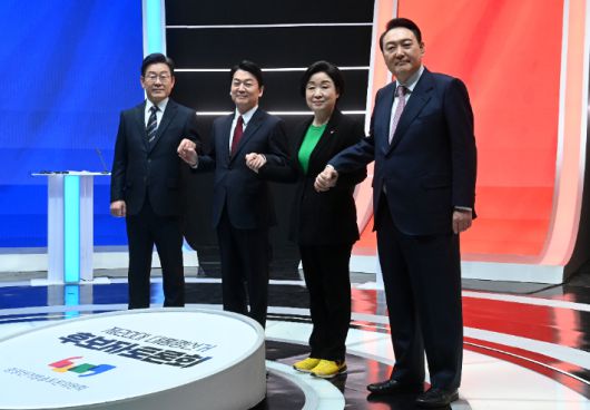 21일 오후 서울 마포구 MBC 미디어센터 공개홀에서 열린 중앙선거방송토론위원회 주관 제20대 대통령선거 후보 초청 1차 토론회에 앞서 대선 후보들이 기념촬영을 하고 있다. 공동취재21일 열린 대선 후보 4인 1차 법정 TV토론은 '경제분야' 토론인 만큼 자칫 싱거울 수도 있다는 예상을 완전히 뒤엎은, 말 그대로 혈전의 장이었다.