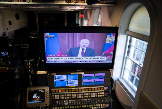 블라디미르 푸틴 러시아 대통령이 21일(현지 시각) 수도 모스크바 크렘린궁에서 우크라이나 동부 분쟁 지역인 돈바스 지역(도네츠크, 루한스크)의 독립을 인정하는 내용의 연설을 하고 있다. 연설 모습이 백악관 브리핑룸 카메라를 통해 중계되고 있는 모습. /EPA 연합뉴스 |