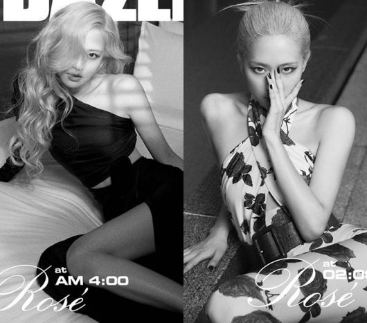 로제는 긴 천으로 몸을 한 번 감싼 듯 한쪽 어깨와 허리 라인, 허벅지까지 과감하게 드러나는 드레스를 완벽하게 소화했다. 흑백 화보 속에서도 로제는 관능미를 한껏 드러내 눈길을 사로잡았다.