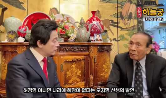 22일 허 후보의 유튜브 채널 ‘허경영TV’에는 지난 20일 경기 양주시 장흥면에 있는 ‘하늘궁’에서 허 후보와 오지명이 만나는 영상이 올라왔다.