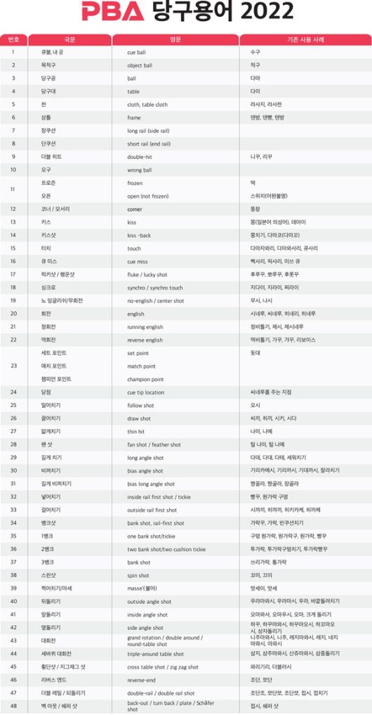 이번 'PBA 당구용어 2022'를 통해 발표된 용어는 총 48개로 우라(뒤돌리기) 하꾸(옆돌리기) 오마(앞돌리기) 빵꾸(넣어치기) 등 기술 용어를 비롯 다마(당구공) 다이(당구대) 등 당구 용품 용어 및 경기 용어 등에 대한 표준화 작업을 거쳤다.