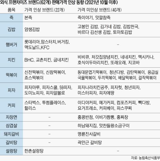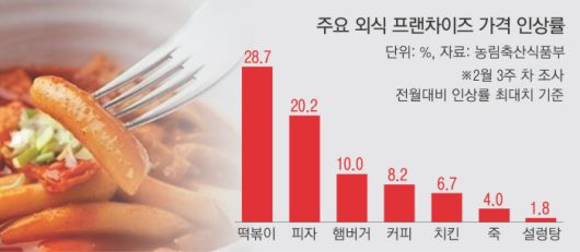 23일 농림축산식품부가 공개한 62개 외식 프랜차이즈 업체(12개 품목)의 2월 3주차 판매가격 조사 결과를 보면, 조사 대상 중 16개 업체가 전월보다 가격을 올렸다. 외식 프랜차이즈 업체 25%가 한 달 새 대표 메뉴의 가격을 인상한 것이다. 조사 대상 품목은 죽, 김밥, 햄버거, 치킨, 떡볶이, 피자, 커피, 자장면, 삼겹살, 돼지갈비, 갈비탕, 설렁탕 등이다. 품목별로는 죽(4.0%), 햄버거(1.1~10.0%), 치킨(5.9~6.7%), 떡볶이(5.4~28.7%), 피자(3.2~20.2%) 등이 전월 대비 인상됐다.
