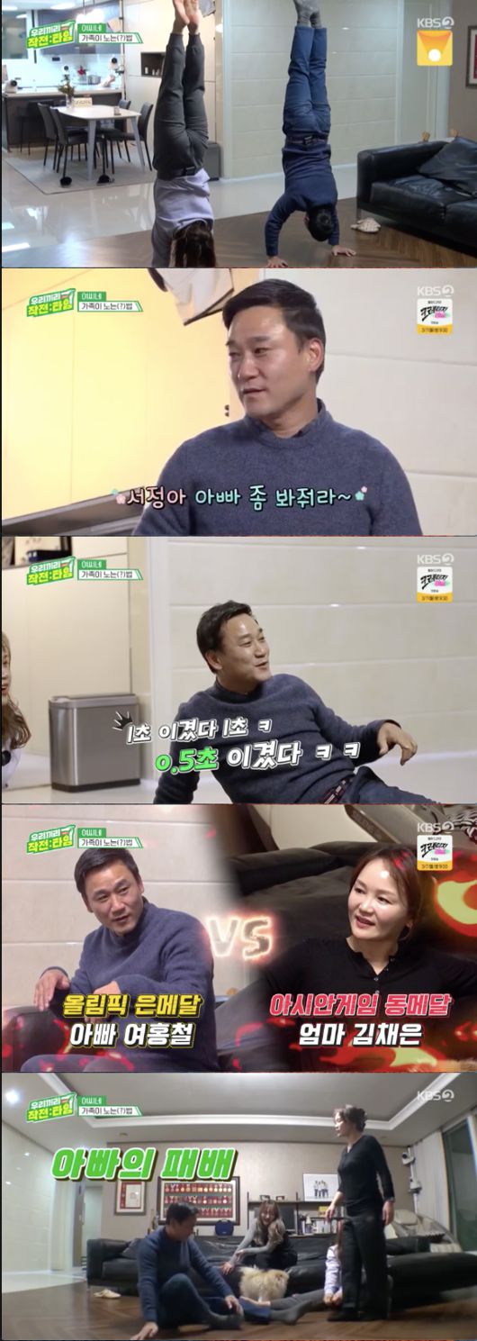 이어 여서정과 여홍철 부녀의 물구나무서기 대결이 이어졌다. 3초만에 여홍철은 무너지고 말았다. 여홍철은 “아빠한테 핸디캡을 줘야한다”라고 말하기도. 이어 두번째 대결이 이어졌고, 여서정이 먼저 쓰러져 여홍철이 승리를 가져갔다. 여홍철은 “1초 이겼다. 0.5초 이겼다”라고 말하며 웃음을 참지 못했다.