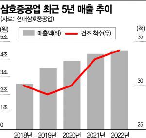 23일 전남 영암에 위치한 현대삼호중공업 조선소. 내부에 들어서자 육중한 선박 블록과 액화천연가스(LNG) 탱크 조각들이 약231만㎡(약 70만평)규모의 조선소를 가득 채웠다. 블록 조각들은 운반차에 실린 채 드넓은 조선소 내를 휘저었다. 도크(선박 건조 공간)와 안벽(선박을 해안에 접안시키도록 만든 구조물)에는 LNG 운반·추진선와 스크러버(탈황장치)를 설치한 선박 등 친환경 배들이 줄줄이 늘어서 있었다. 흡사 미래·친환경 선박의 진열장 같았다.