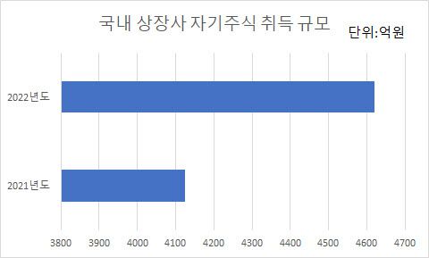 24일 금융감독원 전자공시시스템에 따르면 올해 들어 국내 상장사들의 주주가치 제고를 위한 자기주식 취득 규모는 4621억2000만원으로 전년 동기 4124억2000만원 대비 12%가 증가했다.