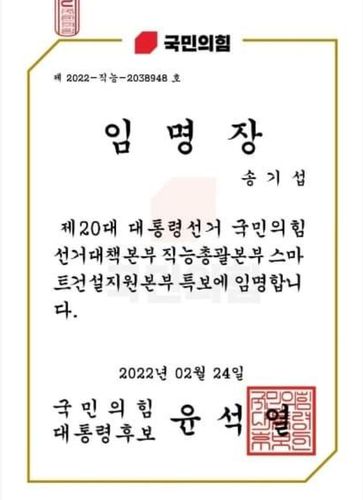 송 군수가 함께 게시한 사진에는 국민의힘 윤석열 대통령 후보 명의로 된 임명장에 '제20대 대통령선거 국민의힘 선거대책본부 직능총괄본부 스마트건설지원본부 특보에 임명합니다'라는 문구가 적혀 있다.