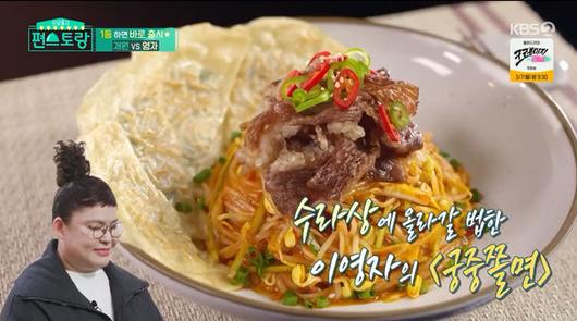 25일에 방송된 KBS2TV '신상출시 편스토랑'에서는 정상훈, 이영자, 김재원, 류수영이 분식 메뉴로 대결을 펼친 가운데 이영자의 '궁중쫄면'이 최종 메뉴로 선정됐다.
