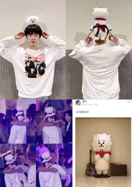 콜드플레이의 오랜 팬인 진은 최근 GQ와의 인터뷰에서 크리스 마틴에게 선물받은 그의 기타를 어디에 두는 게 나을지 물어봤을 때 크리스 마틴이 알제이 옆이 낫겠다고 말해줘서 큰 고민 없이 거기에 두게 됐다고 밝혔다.