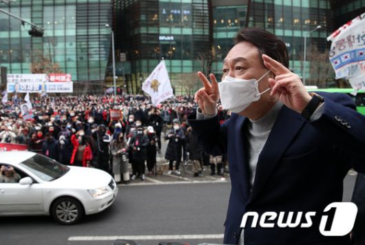 (서울=뉴스1) 국회사진취재단 = 윤석열 국민의힘 대선 후보가 26일 서울 구로구 홈플러스 신도림점 앞에서 시민들을 향해 지지를 호소하고 있다. 2022.2.26/뉴스1eastsea@news1.kr[© 뉴스1코리아(news1.kr), 무단 전재 및 재배포 금지]