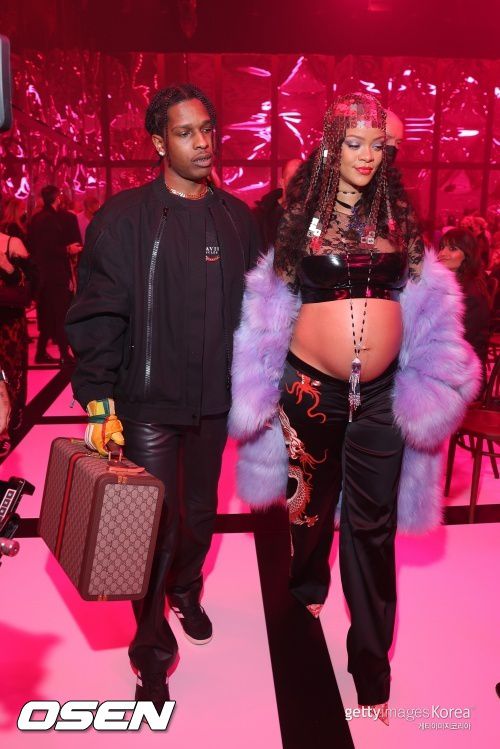 리한나는 25일(현지시간) 이탈리아 밀라노에서 열린 밀라노 패션위크 가을/겨울 2022/23일 구찌 쇼에서 연인 라키와 함께 등장해 눈길을 사로잡았다.