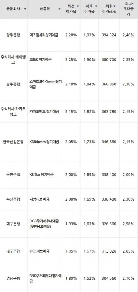 이어 신한은행 ‘신한 S드림 정기예금’(1.50%)‧‘쏠편한 정기예금’(1.50%), 전북은행(은행장 서한국) ‘스마트정기예금 (만기일시지급식)’(1.50%)‧‘시장금리부정기예금 (만기일시지급식)’(1.50%), NH농협은행(은행장 권준학) ‘NH내가그린(Green)초록세상예금’(1.40%), 제주은행(은행장 서현주) ‘사이버우대 정기예금 (만기지급식 –일반)’(1.30%)‧‘제주Dream 정기예금 (개인/만기 지급식)’(1.30%), 하나은행(은행장 박성호) ‘하나의정기예금’(1.30%) 순으로 금리가 높다.