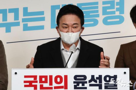 국민의힘 원희룡 정책본부장이 28일 서울 여의도 중앙당사에서 기자회견을 열고 대장동 배수구 문건 내용을 실물 공개하며 발언하고 있다.