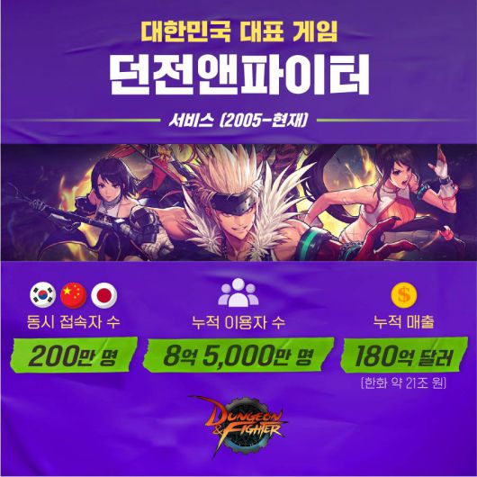 2005년 8월 이색적인 게임 하나가 출시된다. 바로 ‘던전앤파이터’다. 당시에는 3D 그래픽을 활용한 온라인 RPG가 큰 인기를 얻었다. 던파는 인기를 끌던 3D 게임과 달리 2D 도트 그래픽과 횡스크롤 진행 방식을 전면에 내세웠고, 과거 오락실에서 즐기던 아케이드 게임의 조작 방식을 온라인에서 성공적으로 구현했다. ‘액션 쾌감’이라는 개발 모토에 맞춰 각종 콤보 액션이 가능한 극한의 손맛을 제공하며 인기몰이에 나섰다.이러한 손맛으로 입소문을 타며 던파는 흥행에 성공한다. 출시 후 1년 만에 회원 수 100만 명, 동시 접속자 수 5만 명을 기록한 던파는 2007년엔 누적 회원 500만 명, 동시 접속자 수 15만 명을 기록하는 등 성장세를 이어갔다. 2008년 중국에 진출한 던파는 서비스 한 달 만에 중국 온라인게임 1위에 올랐다. 2009년 말에는 국산 게임 중 최초로 한국·중국·일본 3개국 동시 접속자 수 200만 명이라는 경이로운 기록을 세우며 연 매출 1,000억 원을 돌파했다.