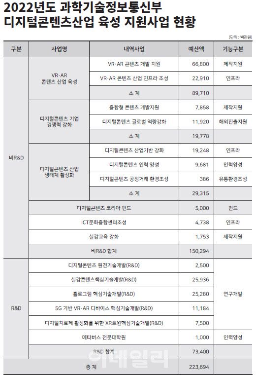 과기정통부는 올해부터 메타버스 지원사업에 총 2237억원을 투입한다. 주요 사업으로는 △민간수요 기반 산업융합형 및 생활·경제형 메타버스 플랫폼 개발·실증(340억원) △메타버스 청년전문가 양성을 위한 메타버스 아카데미(180명, 46억원) 개원 △석·박사 인재 양성을 위한 메타버스 랩 운영(10개, 24억원) △메타버스 융합대학원 신설(10억원) △메타버스 특화시설(181억원) △메타버스 지역거점(13개) 지원(96억원) △VR·AR디바이스 핵심기술개발(112억원) △초실감 메타버스 구현을 위한 실감콘텐츠 핵심기술 개발 및 상용화 지원(259억원) △홀로그램 기술개발(253억원) 등이 있다. △1000억원 규모의 메타버스 M&A(인수·합병) 펀드 조성도 준비한다. 자세한 내용은 NIPA 홈페이지 자료집에서 확인할 수 있다.