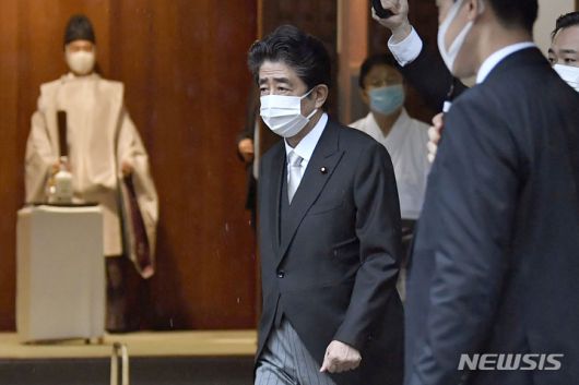[도쿄=AP/뉴시스]지난해 8월 15일 일본 패전일을 맞아 아베 신조 일본 전 총리가 A급 전범이 합사된 야스쿠니 신사에 방문해 참배하기 위해 걸음을 옮기고 있다. 2022.02.28. |