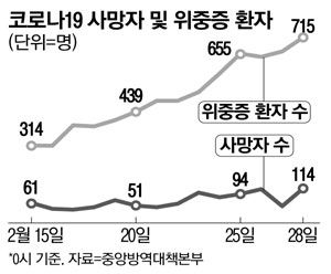 이날 중앙방역대책본부에 따르면 28일 0시 기준 코로나19 확진자는 13만9626명을 기록했다. 특히 사망자와 위중증 환자가 가파르게 늘어나 우려가 커지는 분위기다. 이날 사망자가 114명에 달해 역대 최다치를 갈아치웠다. 연령대별 사망자는 80세 이상이 68명으로 가장 많았고 이어 70대 32명, 60대 9명, 50대 5명이다. 누적 치명률은 0.26%다. 위중증 환자는 전날보다 52명 증가한 715명이었다. 위중증 환자 수는 보름 만에 200명대에서 700명대로 급증했다.