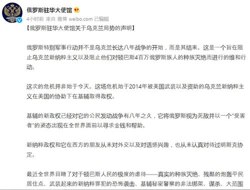 대사관은 28일 웨이보(微博·중국판 트위터) 계정에 올린 성명에서 "블라디미르 푸틴 대통령이 연설에서 밝힌 바와 같이, 우리는 러시아의 군사행동에 개입할 것을 고려하거나, 무력으로 러시아를 위협할 것을 고려하는 측에 경고한다"며 "간섭하지 말라. 그렇지 않으면 곧 당신들은 역사상 가장 비참한 후과를 보게 될 것"이라고 밝혔다.