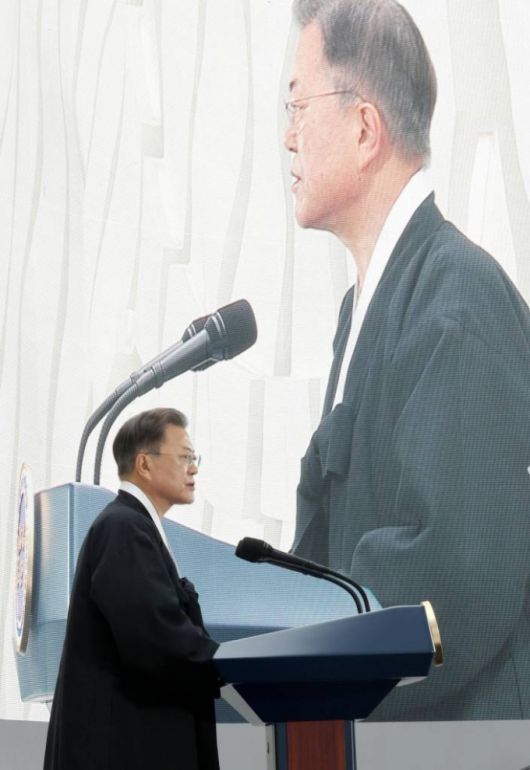 문 대통령은 또 임기 중 마지막 3·1절임을 의식한듯 일본에 반성을 촉구하며 대화에 나서라고 했다. 문 대통령은 "한일 관계를 넘어서 일본이 선진국으로서 리더십을 가지기를 진심으로 바란다"며 "그러기 위해서 일본은 역사를 직시하고, 역사 앞에서 겸허해야 한다"고 강조했다.