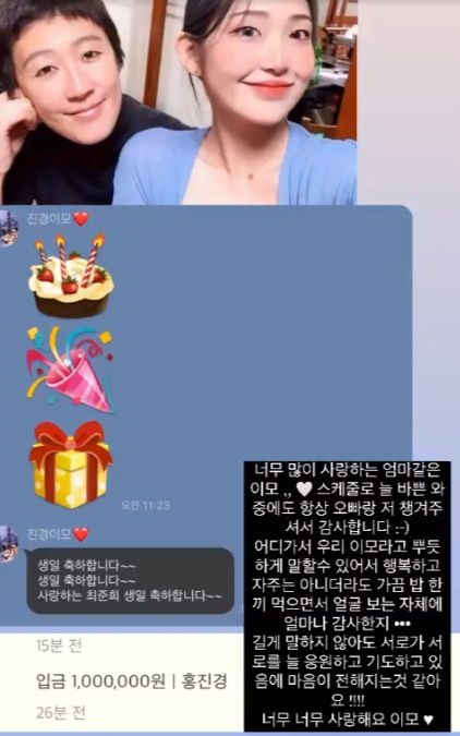 공개된 사진 속에는 이날 스무살 생일을 맞은 최준희와 홍진경이 나눈 메시지가 담겨 있다. 홍진경은 최준희를 위해서 생일 축하 이모티콘을 비롯해 "사랑하는 최준희 생일 축하합니다~~"라며 100만원을 용돈으로 보내는 등 살뜰히 챙겼다.
