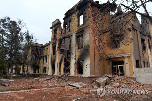 러시아 포격으로 파괴된 우크라이나 제2도시 하리코프의 한 학교. [AFP 연합뉴스] 2022. 3. 1. photo@yna.co.kr |