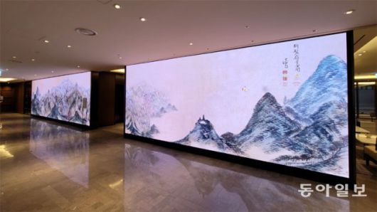 리노베이션을 통해 새롭게 단장한 앰배서더서울풀만 호텔 로비에 들어서면 먼저 눈에 띄는 것이 미디어아티스트 이이남 작가의 대형 아트월 ‘금강의 빛’ 작품이다. 겸재 정선이 72세 때인 1747년에 그린 ‘금강내산(金剛內山)’을 바탕으로 10분 8초 동안 금강산의 사계절 변화가 아름답게 펼쳐진다. 봄이 와서 나비가 날고, 가을 풍악산에는 단발령과 금강내산이 케이블카로 연결된다. 겨울 개골산 설경에는 도시 야경이 펼쳐지기도 한다. 그림 속 금강산의 산세 곳곳에는 금수장 여관부터 앰배서더호텔그룹의 역사가 담긴 호텔들이 깨알처럼 숨어 있다.