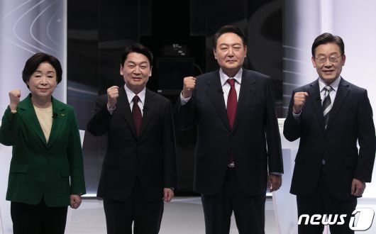 25일 서울 마포구 상암동 SBS스튜디오에서 열린 중앙선거방송토론위원회 주관 제20대 대통령선거 후보 초청 2차 법정 TV 토론회에서 대선 후보들이 기념촬영을 하고 있다. 왼쪽부터 정의당 심상정, 국민의당, 안철수, 국민의힘 윤석열, 더불어민주당 이재명 대선 후보. 2022.2.25/뉴스1 © News1 국회사진취재단 |