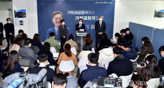 [서울=뉴스핌] 이형석 기자 = 김동연 새로운물결 대선 후보가 2일 서울 영등포구 선거 캠프에서 기자회견을 열고 후보 사퇴 및 이재명 더불어민주당 후보의 지지 의사를 밝히고 있다. 2022.03.02 leehs@newspim.com