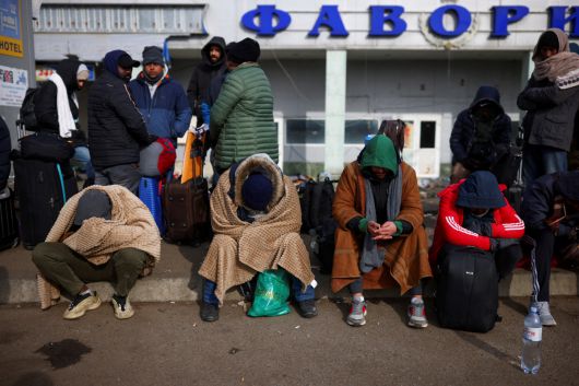 외국인 피난민들이 1일(현지시간) 폴란드로 가기 위해 우크라이나 국경에서 대기하고 있다. 모스티스카/로이터연합뉴스 |
