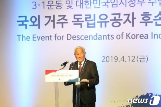 (서울=뉴스1) 신웅수 기자 = 대한민국임시정부 수립 100주년을 맞아 방한한 도산 안창호 선생의 아들 안필영(랠프 안) 옹이 지난 2019년4월12일 서울 중구 그랜드엠버서더호텔에서 열린 2차 국외 독립유공자 후손 초청행사 만찬에서 답사를 하고 있다.(국가보훈처 제공) 2019.4.13/뉴스1 |