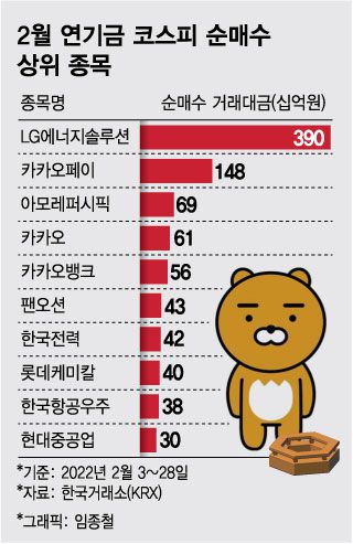연기금이 지난달 코스피에서 제일 많이 순매수한 종목은 LG에너지솔루션으로, 거래대금은 약 3900억원이다. 이어 카카오페이, 아모레퍼시픽, 카카오, 카카오뱅크 등이다. 카카오페이, 카카오, 카카오뱅크 등 카카오그룹주를 합친 거래대금은 약 2650억원이다.