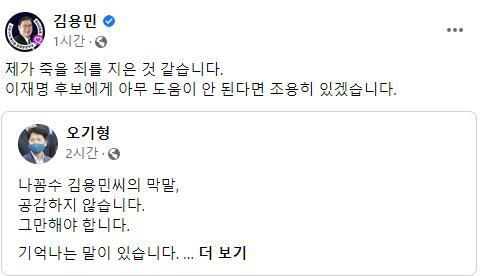 김 이사장은 아울러 오기형 민주당 의원이 “나꼼수 김용민씨의 막말, 공감하지 않습니다”라며 “그만해야 합니다”라고 비판한 게시글을 공유하기도 했다.