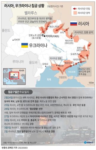 러시아군은 이날 크림반도와 면한 남부 요충지 헤르손을 사실상 점령하고, 아조프해 변의 항구도시 마리우폴을 포위하는 등 공세를 강화하고 있다.