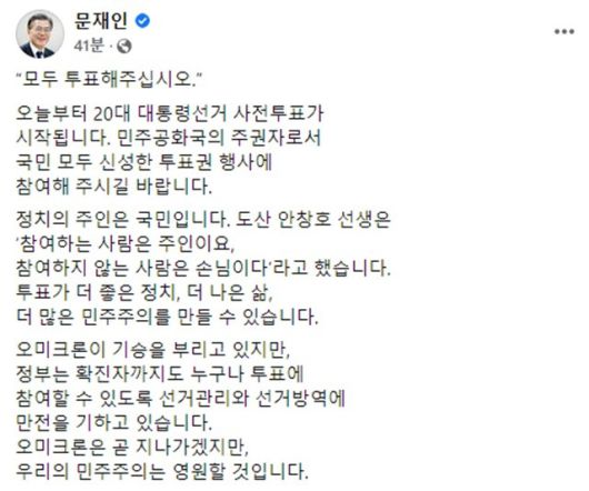 문 대통령은 투표에 앞서 SNS를 통해 "오늘부터 20대 대선 사전투표가 시작된다"라며 "민주공화국의 주권자로서 국민 모두 신성한 투표권 행사에 참여해 주시길 바란다"고 당부했다.