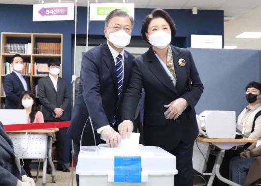 문 대통령 부부는 지난해 4·7 서울시장 보궐선거 때도 삼청동 주민센터에서 사전투표를 한 바 있다. 또 2017년 5월 9일 19대 대선 사전투표 당시에도 김 여사와 함께 사전투표를 했다.
