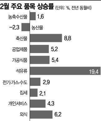 이날 2월 소비자물가 상승률(3.7%)이 5개월 연속 3%대를 기록한 것은 국제유가 급등에 기인한 바가 크다. 품목별로 상품이 전년 동월 대비 4.3% 올랐는데 그중에서도 자동차용 액화석유가스(LPG·23.8%), 경유(21.0%), 휘발유(16.5%)가 일제히 상승하면서 석유류(19.4%) 가격이 급등했다. 석유류의 물가 기여도는 0.79%포인트였다.