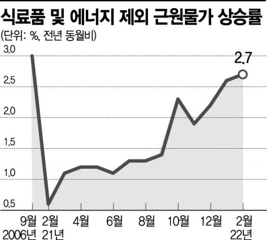 물가의 기조적 흐름을 보여주는 근원물가(농산물 및 석유류 제외 지수)는 3.2% 올랐다. 2011년 12월(3.6%) 이후 10년 2개월 만에 가장 큰 폭으로 증가했다. 경제협력개발기구(OECD) 기준 근원물가인 식료품 및 에너지 제외 지수는 2.9% 올라 2009년 6월(3.0%) 이후 최대 상승 폭을 기록했다.