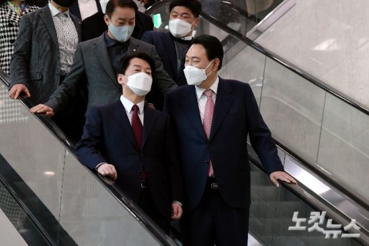 윤석열 국민의힘 대선 후보와 안철수 국민의당 대표가 3일 서울 여의도 국회 소통관에서 단일화 기자회견을 마치고 함께 이동하고 있다. 윤창원 기자 |