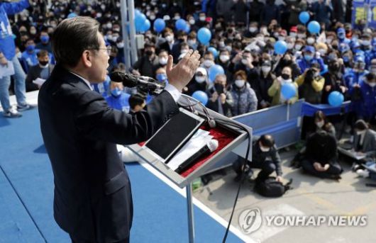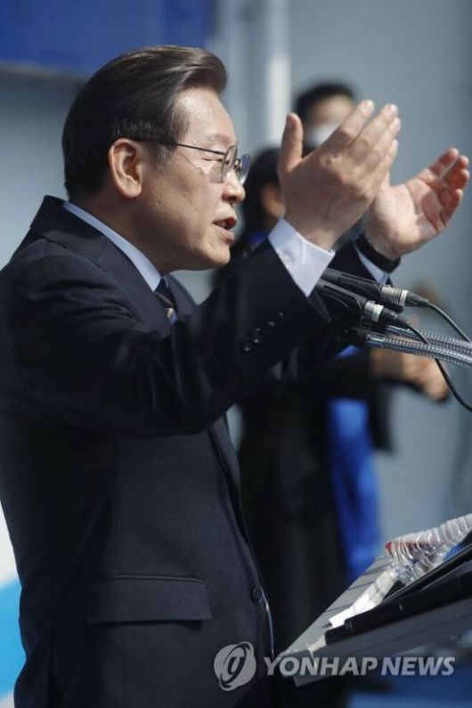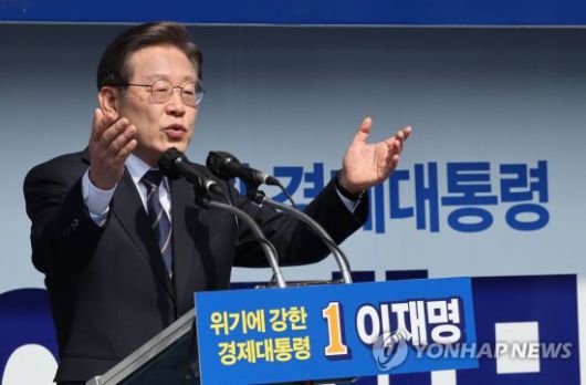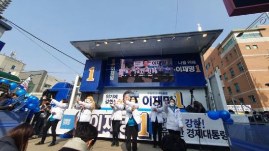 연설이 끝나자 이 후보는 ‘이재명’이란 연호에 맞춰 엄지를 치켜세운 주먹을 만세하며 흔들어보였다. 지지자들은 이 후보가 연설을 쉴 때마다 ‘기호 1번 이재명’을 외치며 화답했다.