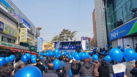 [강원도 홍천 = 구채은 기자] 4일 오전 11시45분. 강원도 원주시 홍천로 8길에 위치한 홍천중앙시장. ‘多(다)있는 홍천중앙시장’ 붉은 간판 옆으로 이재명 더불어민주당 대선 후보의 유세차가 정차돼 있었다. 유세 무대를 둘러싸고 파란색 가림막을 경계로 수십여명의 사람들이 파란 풍선을 흔들며 서 있었다. 이 후보를 기다리는 인파였다. 지지자들로 보이는 사람들은 이 곳에서 ‘이재명’을 연호했다.