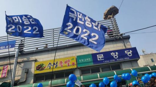 지지자들이 밀집한 공간에는 ‘낮에는 굿판, 밤에는 술판, 나라망치는 선택입니다’란 깃발이 펄럭였고, ‘국민승리 2022’ 피켓을 든 사람도 있었다. ‘항공대 이전 없이 홍천군 발전없다’ ‘확고한 실용주의, 확실한 국가안보’ 숀푯말도 눈에 띄었다. 부채를 든 무속인이 그려진 깃발에는 ‘청와대를 굿판으로 만들 수 없다’는 글이 써있었다.