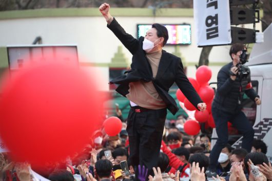 대구 유세에선 당내 경선 경쟁자였던 홍준표 의원이 시민들을 향해 윤 후보 지지를 호소하기도 했다. 대선을 5일 앞둔 이 날은 윤 후보가 검찰총장직에서 물러나겠다며 법무부에 사표를 제출한 지 딱 1년째 되는 날이기도 하다.