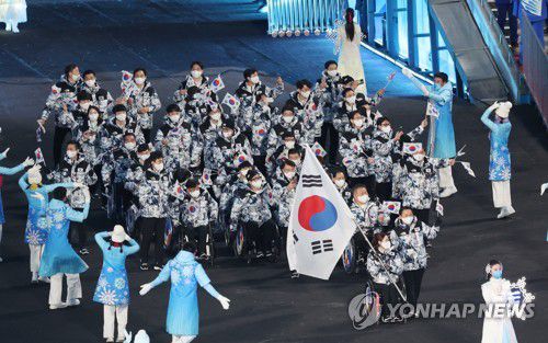 (베이징=연합뉴스) 패럴림픽공동취재단 = 2022 베이징 동계패럴림픽에 참가한 한국 선수단이 개회식에서 힘차게 모습을 드러냈다.