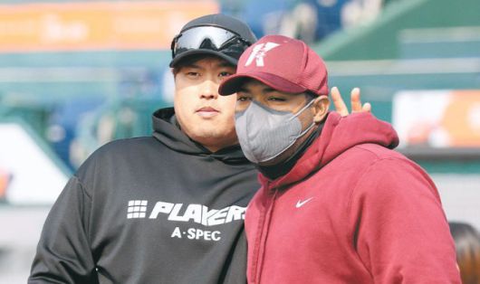류현진(토론토·왼쪽)과 올 시즌 키움에 입단한 외국인 야시엘 푸이그가 4일 대전 한화생명이글스파크에서 만나 장난을 치며 반가움을 나누고 있다. 류현진이 메이저리그(MLB)에 진출했던 2013년 LA 다저스에서 함께 데뷔한 두 선수는 6시즌 동안 한솥밥을 먹으며 친분을 쌓았다. 류현진이 MLB 직장폐쇄로 국내에 남아 친정팀 한화와 함께 훈련을 하고 있었고 이날 한화와 키움의 연습경기가 치러지며 둘은 4년 만에 재회했다.